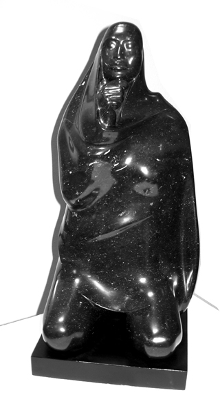 Original sculpture in black marble on two inch black wood base. Signed by the artist in the marble lower left verso: "Amaya 1994."