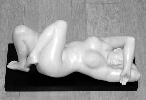 White marble sculpture on a 1 1/2 inch black wood base. Signature and date incised in the stone "Amaya 2002".