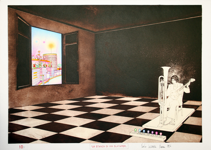 Original etching and aquatint with hand coloring on Fabriano wove paper, signed and dated in the lower margin: "Paolo Carosone Roma 1976". A unique impression from a varied edition. In very good condition, unframed.