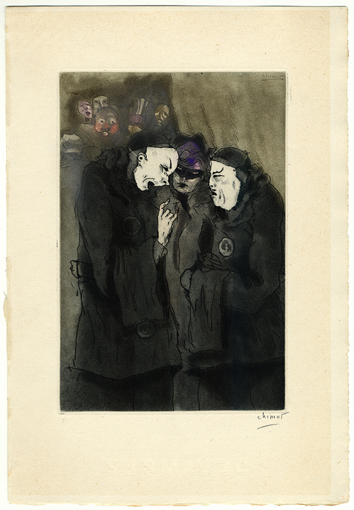 Original etching and aquatint in colors on cream paper with full margins and deckled edges, bearing the Devambes watermark. Hand signed by the artist "Chimot” in pencil, lower right, also signed "Chimot” in the plate, upper right. In very good condition, unframed. Platemark: 7 1/2" x 5"; Sheet size: 11" x 7 1/2" |
