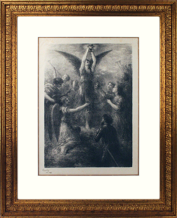 | Original lithograph on wove paper with full margins. Signed and dated on the stone, "Fantin oct. 1898" lower left. In excellent condition, framed with museum quality conservation materials. Image size: 19 3/8" x 13 3/4"; Framed: 33 13/16" x 27 3/8" Catalogue reference: Hédiard 146 Fantin-Latour seems to escape classification within 19th century painting and printmaking, a rare quality for an artist of his time. Born in Grenoble to a society portraitist father who was his first teacher, he moved to Paris with his family while he was still a child. In addition to a classic apprenticeship which he began at the age of fifteen, he learned from the Masters at the Louvre, a lesson that he never forgot, remaining faithful his whole career to a traditional technique. Much of his later career was devoted to lithography. He greatly admired Richard Wagner and did imaginative lithographs illustrating his music and that of other Romantic composers such as Berlioz and Schumann. |
