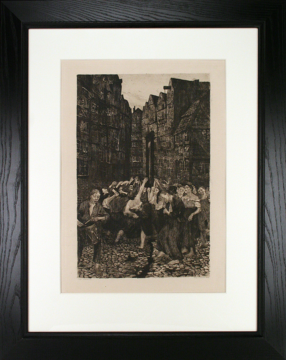 Original line etching, drypoint, and aquatint. With engraved cursive script along the lower plate edge: "Kathe Kollwitz rad" lower left, and "Verlag E. A. Seemann, Leipzig" lower right. The plate was lost. In very fine condition, framed with museum quality conservation materials. This etching, dated 1901 by Lehrs, Sievers and Klipstein, was according to a letter from the artist to Lehrs, dated March 16, 1901 (Staatsbibliothek, Munich), completed by this date. "I am finished with the Carmagnole (...). I showed a trial proof to Steinlen in Paris, who to my joy was interested in it." The title refers to the attack song of the French Revolution which ensued from the capture of Carmagnola; it closes with the refrain "Dansons la Carmagnole./Vive le son du canon." The depiction of a narrow lane in the "Gangeviertel" [quarter of passageways] of Hamburg's former "Neustadt" [new city] shifts the revolutionary event to the Kollwitz's era. |