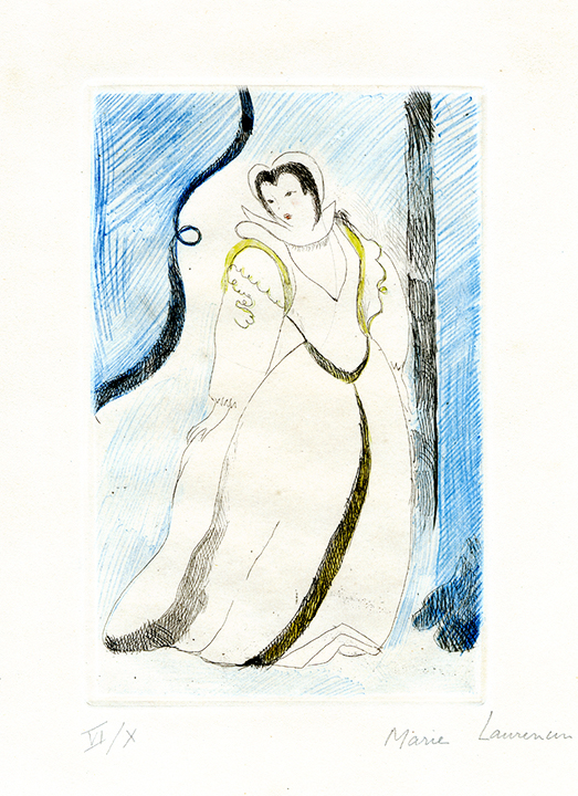 Born on October 31, 1883 in Paris, the young Marie Laurencin was sent to Sèvres by her mother in 1901, where she got familiar with porcelain painting. Her education continued at a school in Paris, followed by the Humbert academy, where Marie Laurencin got acquainted with Georges Braque. She soon met Picasso and Guillaume Apollinaire, who supported her from this time on and integrated her in discussions about art theory, which soon lead to Cubism. The artist's own creative work, however, remained untouched by such theoretical demands; it shows mainly lyrical motifs like graceful, dreamy young girls in pastel coloring and soft shading. This color-sensitive inventiveness leads to a variation of repetitions of form and motifs. The influence of Persian miniature painting and Rococo art are undeniable in Laurencin's works. In 1907 Marie Laurencin gave her debut at the "Salon des Indépendants," followed by a large exhibition at Barbazanges' in 1912 and at P. Rosenberg's in 1920. From 1924 Laurencin also worked on designing stage sets. She produced stage design for Diaghilev's "Ballets russe" and the set for the "Comédie Francaise" in 1928. She also illustrated books, such as André Gide's "La Tentative Amoureuse" and Lewis Caroll's "Alice in Wonderland."